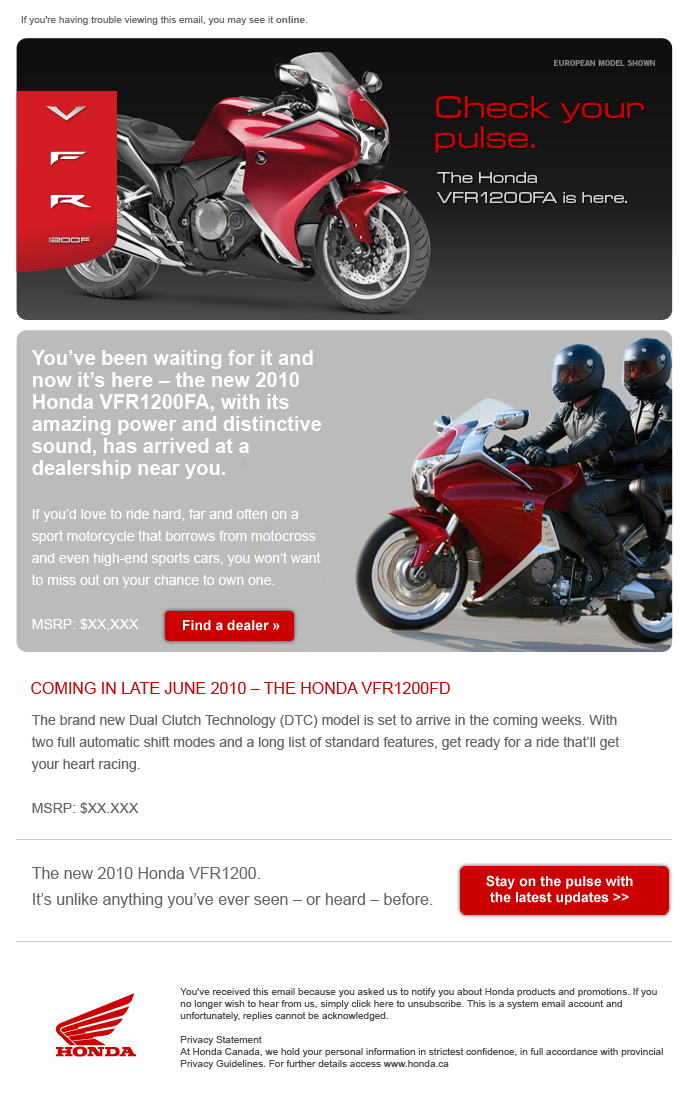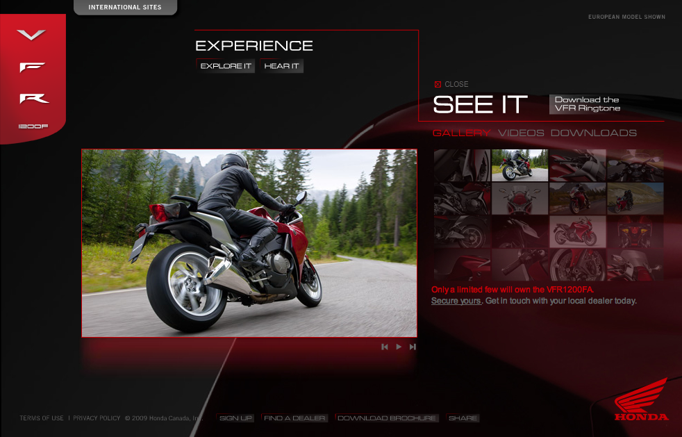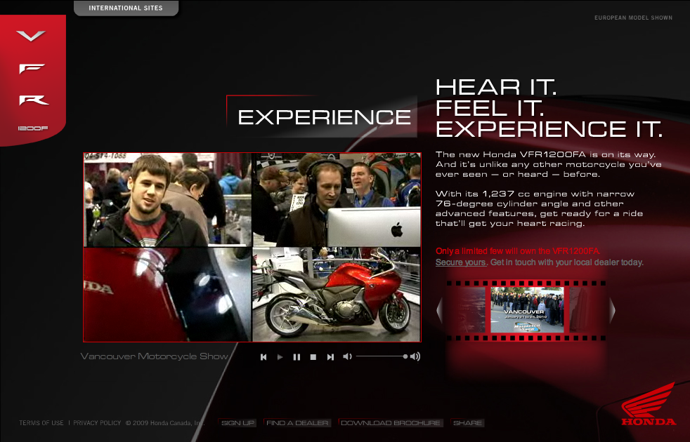 To re-introduce the VFR into the Honda lineup, we brought this launch site to life with video and audio that truly captured the look and feel of this beautifully redesigned motorcycle.