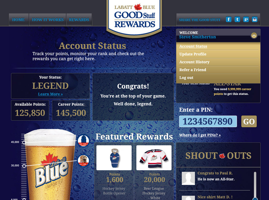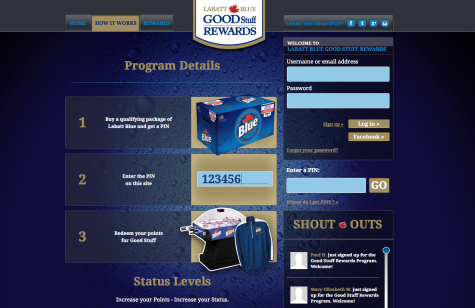 For this fun program, consumers would purchase a specially marked case of Labatt Blue and find a PIN inside that could be entered on the Labatt Rewards site for points.