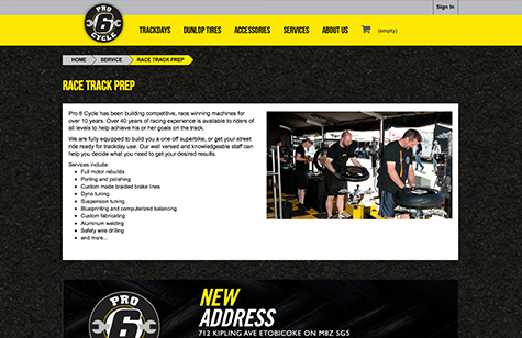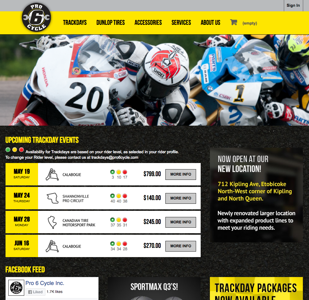 Pro 6 Cycle, Canada’s largest organizer of Motorcycle Trackdays needed a new site. We worked closely with them to apply new branding to our site design, and developed the functionality requirements to handle trackday registrations, rental equipment, rider levels, and much more.